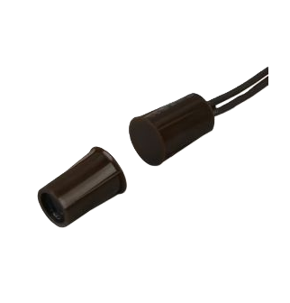 Es un contacto magnético de diseño tubular diseñado específicamente para su instalación empotrada en puertas y ventanas. Su color café lo hace ideal para integrarse discretamente en superficies de madera o marcos oscuros.